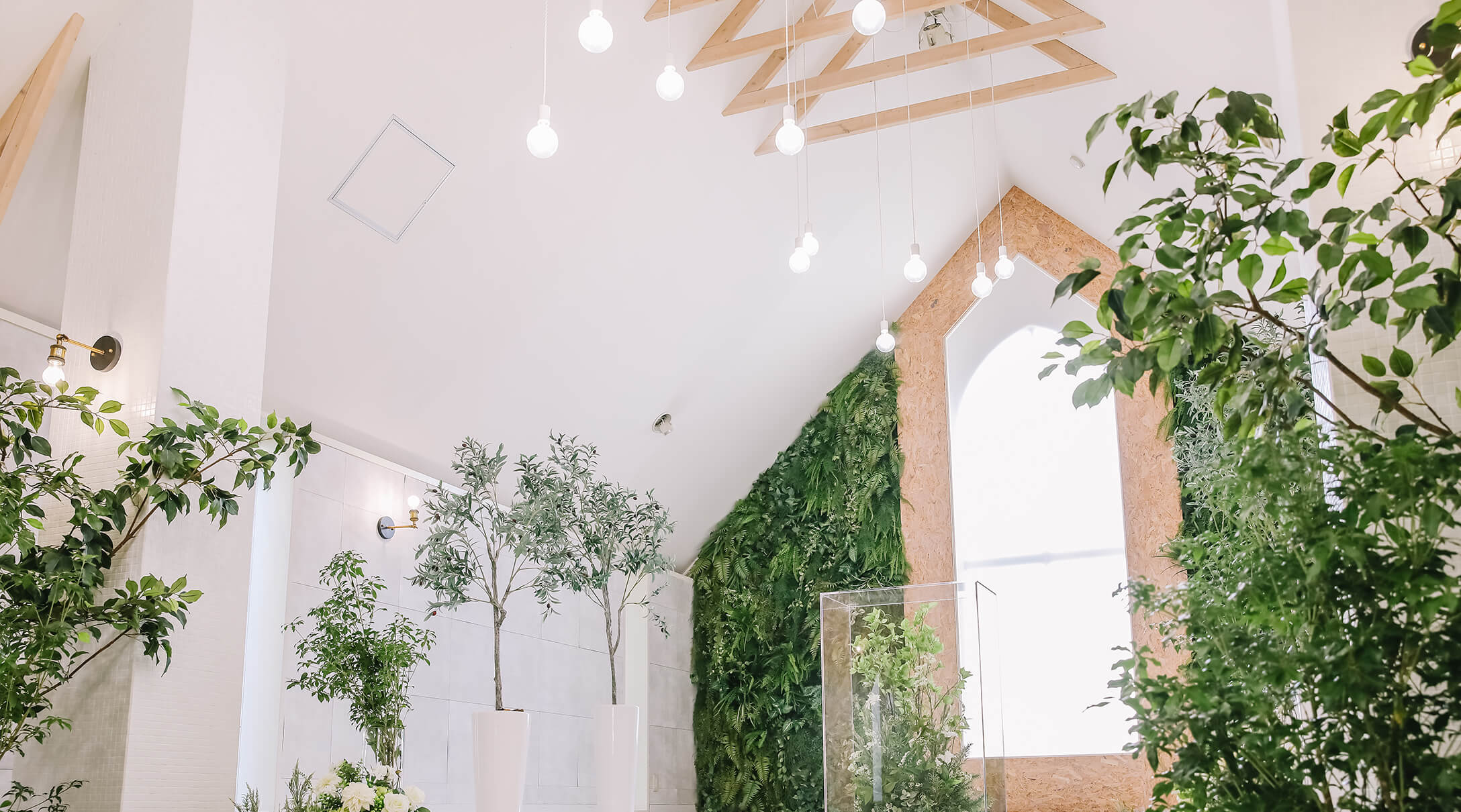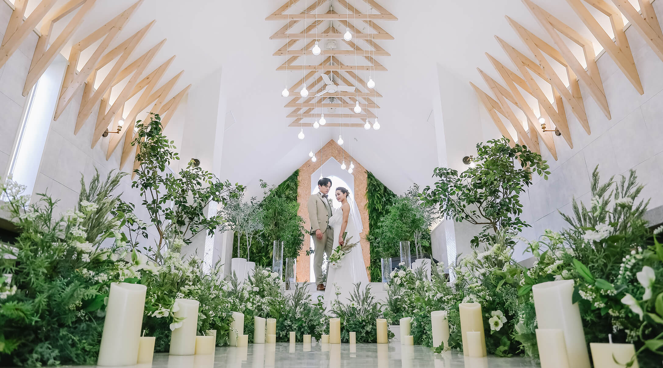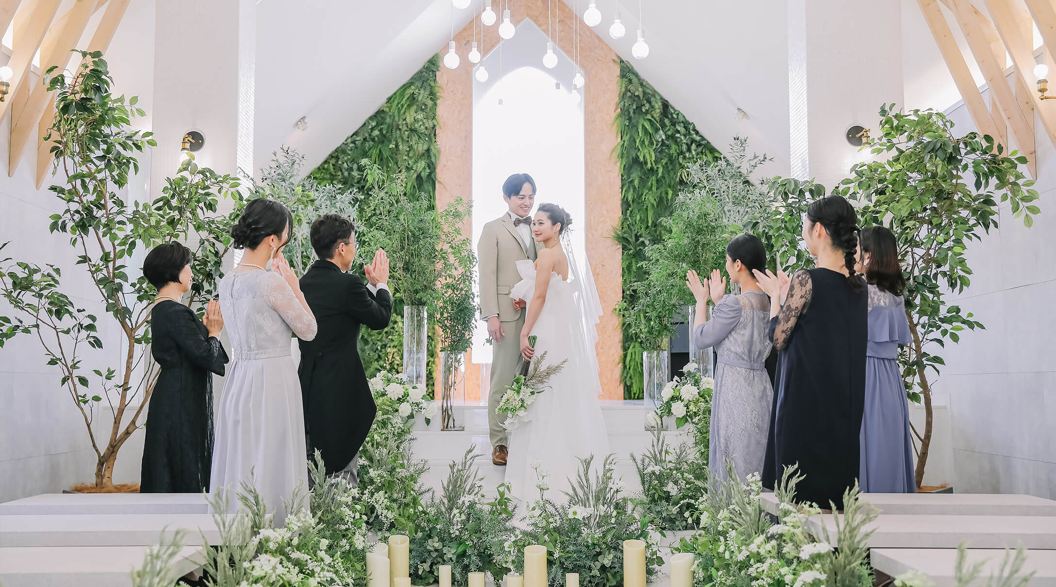 緑と白を基調としたチャペルはまるでリゾート地にある小さな教会。あたたかな雰囲気の中、自然光が降り注ぎおふたりをやさしく包み込みます。