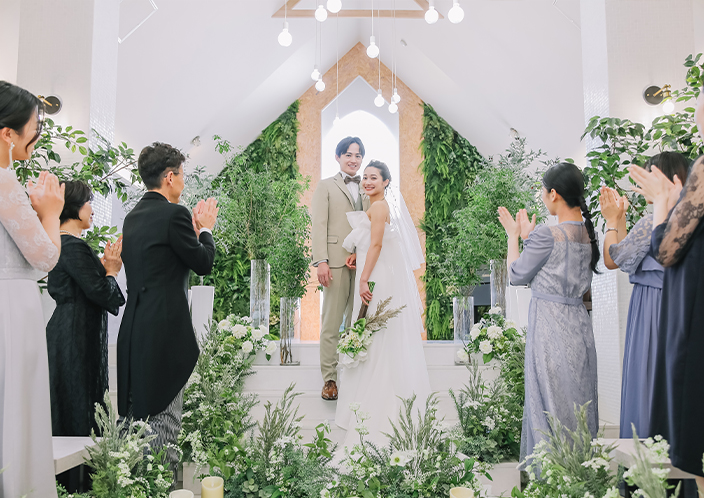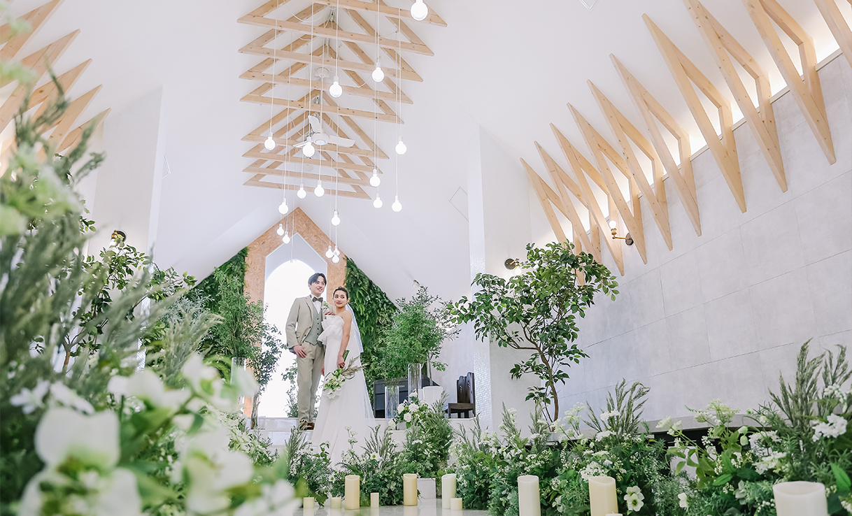 緑と白を基調としたチャペルはまるでリゾート地にある小さな教会。あたたかな雰囲気の中、自然光が降り注ぎおふたりをやさしく包み込みます。